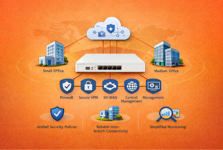 It unites firewall protection, VPN connectivity, SD-WAN routing, and security management into a single system. For small and medium businesses, it translates to homogenous security policies, stable inter-branch connectivity, and simplified day-to-day monitoring.